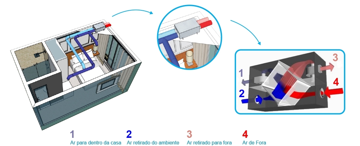 3 – Thermal energy recovery: Indoor and outdoor airflows cross through the heat recovery cell. This process reduces thermal energy losses, optimizing the system and lowering operational costs for heating or cooling the air—making the environment more energy-efficient.