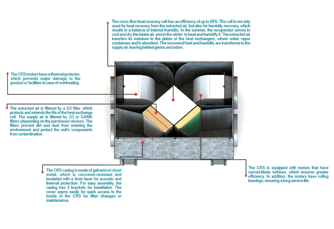 Benefits: ✲ Reduced thermal losses: by transferring thermal energy between airflows, the CRS reduces the need for additional heating or cooling systems✲ Energy efficiency: lowers operational costs and improves the performance of the indoor climate control system