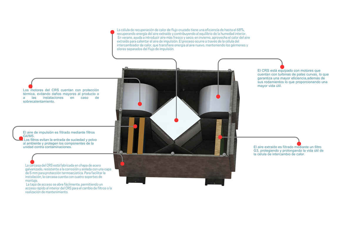 ✲ Reducción de pérdidas térmicas: Al transferir energía térmica entre los flujos de aire, el CRS minimiza la necesidad de sistemas de calefacción o refrigeración adicionales. ✲ Eficiencia energética: Reduce los costos operativos y mejora el rendimiento del sistema de climatización del ambiente.
