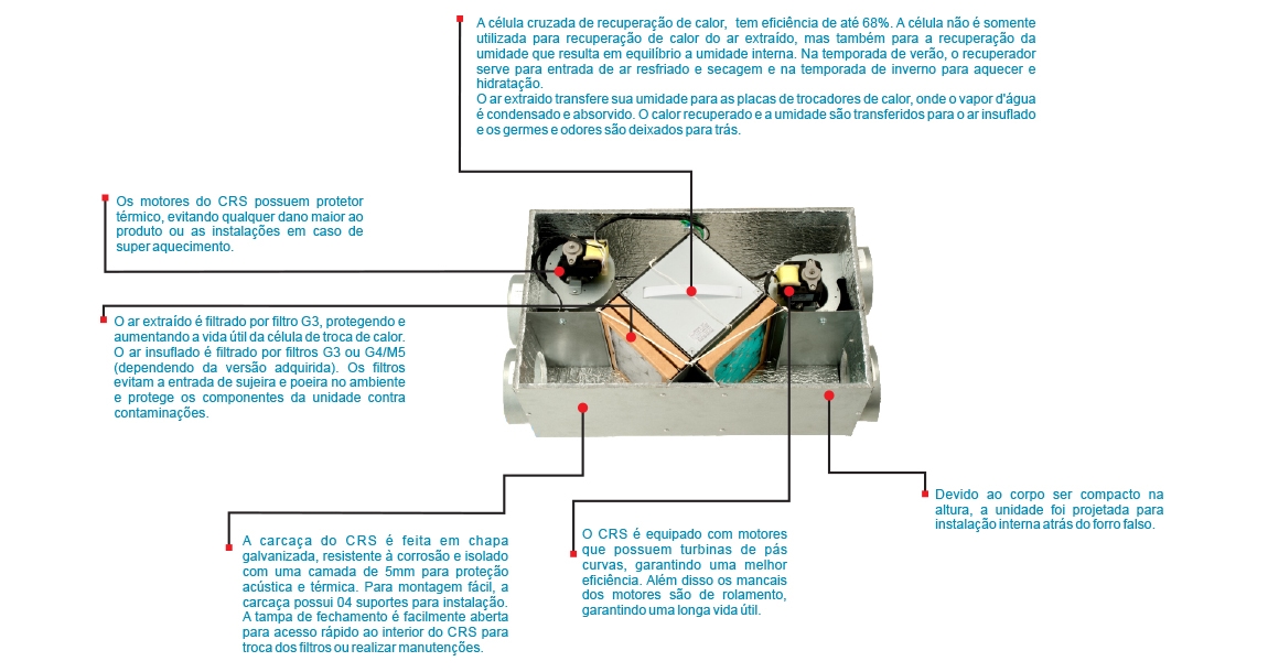 ✲Redução de perdas térmicas: Ao transferir energia térmica entre os fluxos de ar, o CRS minimiza a necessidade de sistemas de aquecimento ou resfriamento adicionais.