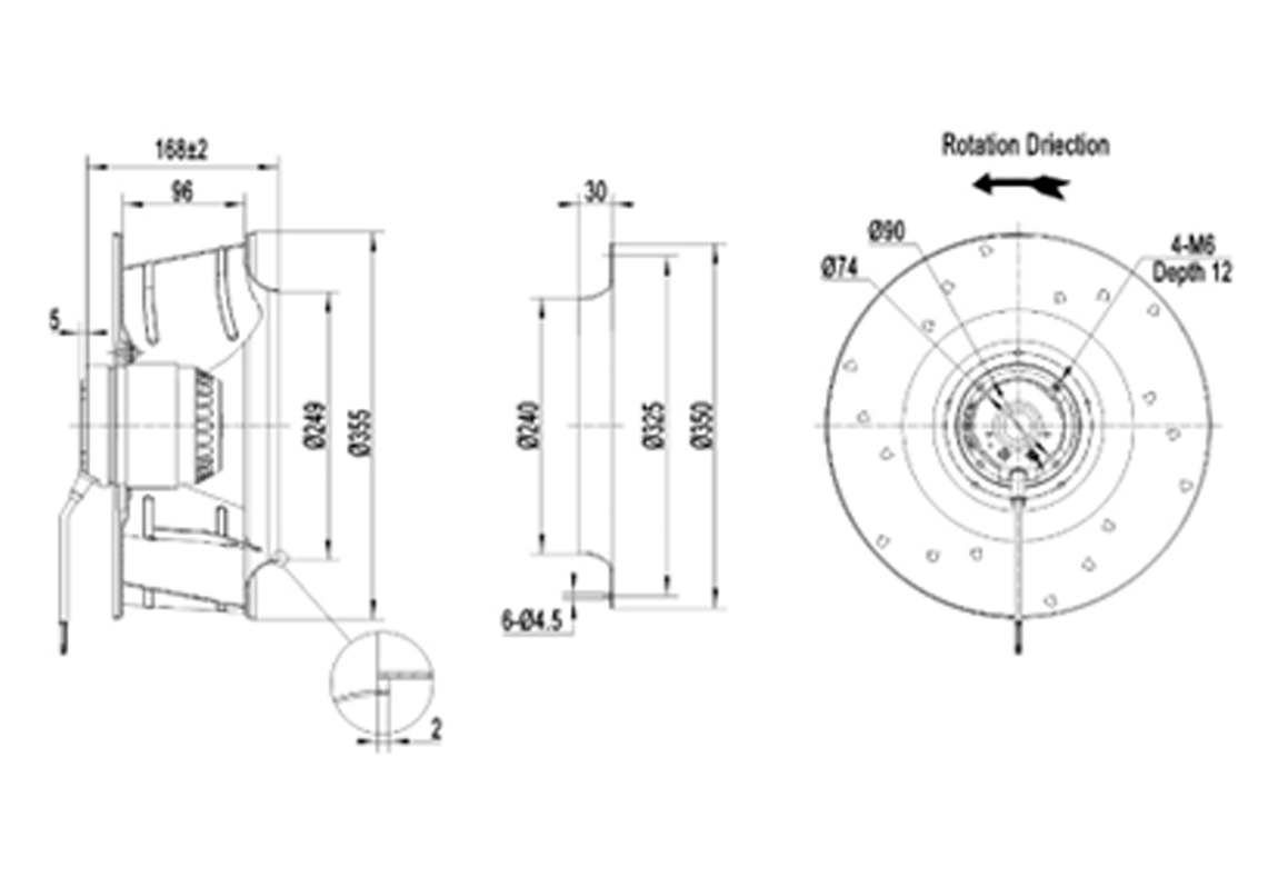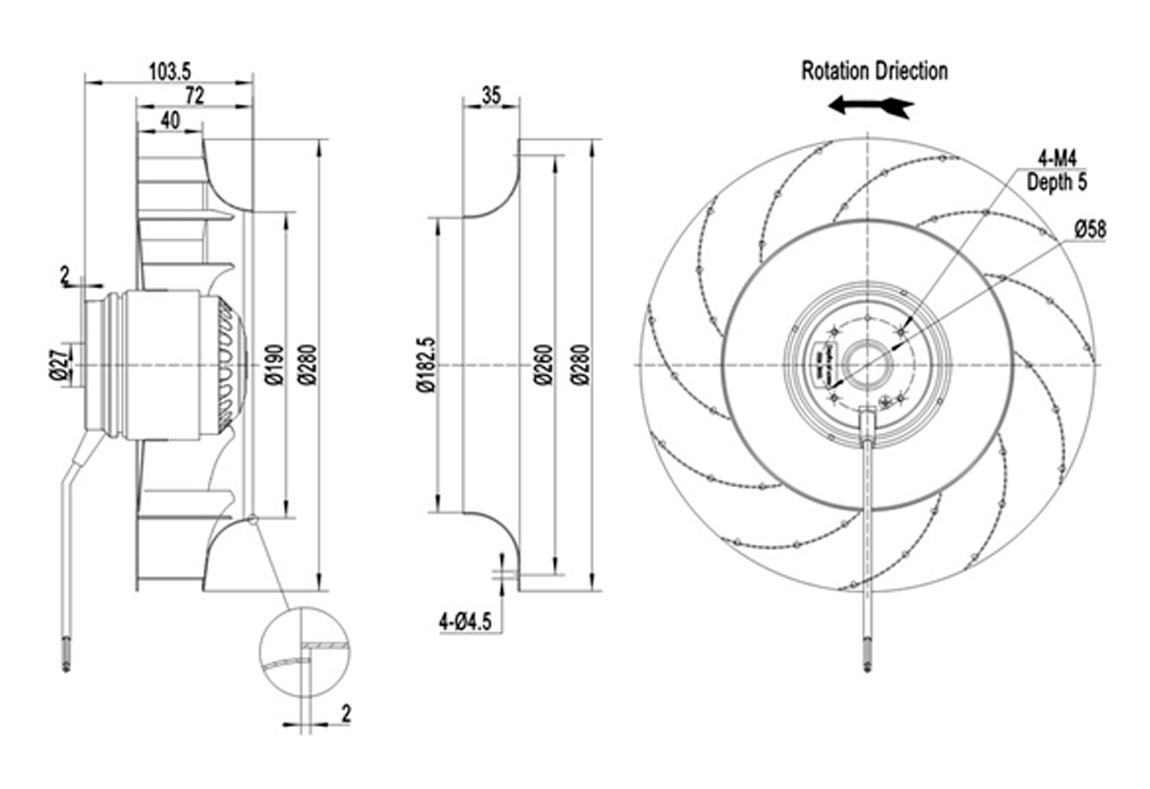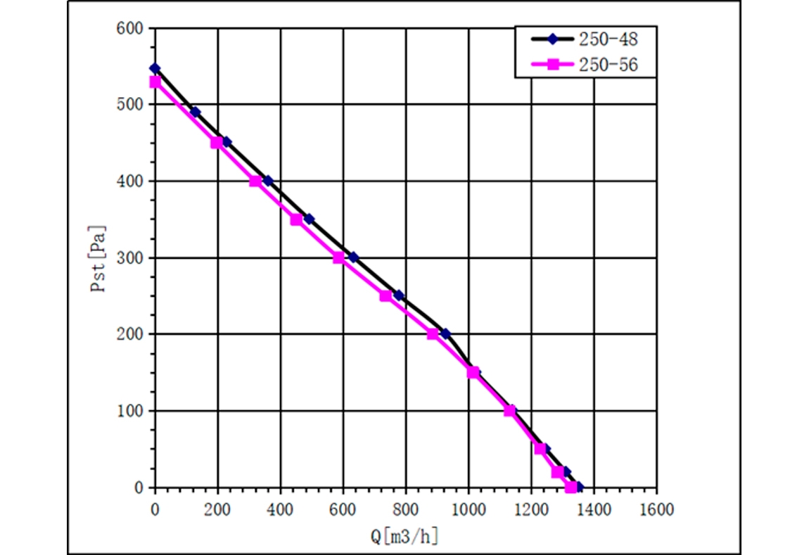 Os ventiladores centrífugos compactos cobrem uma faixa de diâmetros de rotor de φ190 a φ400 mm e apresentam design de rotor externo compacto. Eles geram alta pressão estática (até cerca de 2200 Pa) com baixo nível de ruído e alta eficiência. Esses ventiladores são amplamente usados em HVAC (aquecimento, ventilação e ar-condicionado), sistemas de exaustão e refrigeração em diversas indústrias (equipamentos médicos, data centers, eletrônica de potência etc.). Os modelos utilizam motor AC. Tipicamente o impelidor é de plástico e o rotor de aço. Todos têm proteção IP54, isolamento classe F e certificação internacionais.