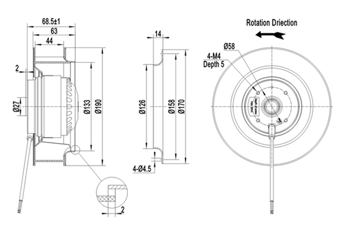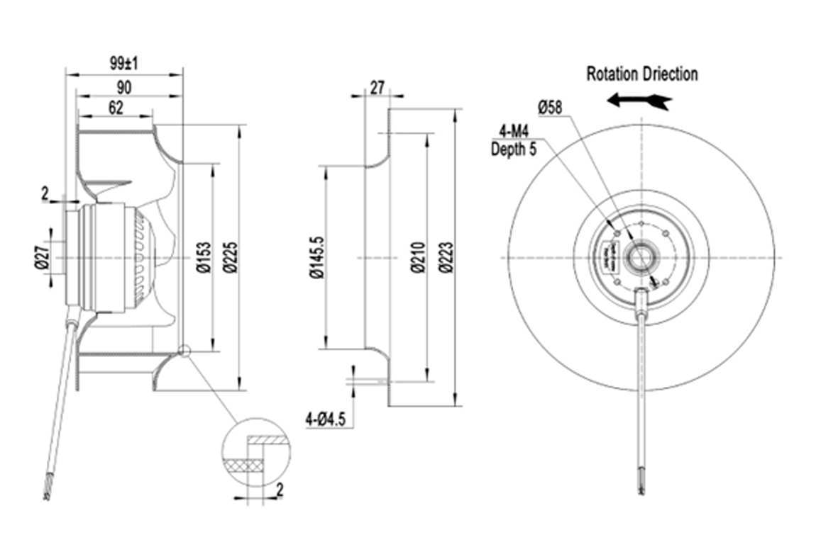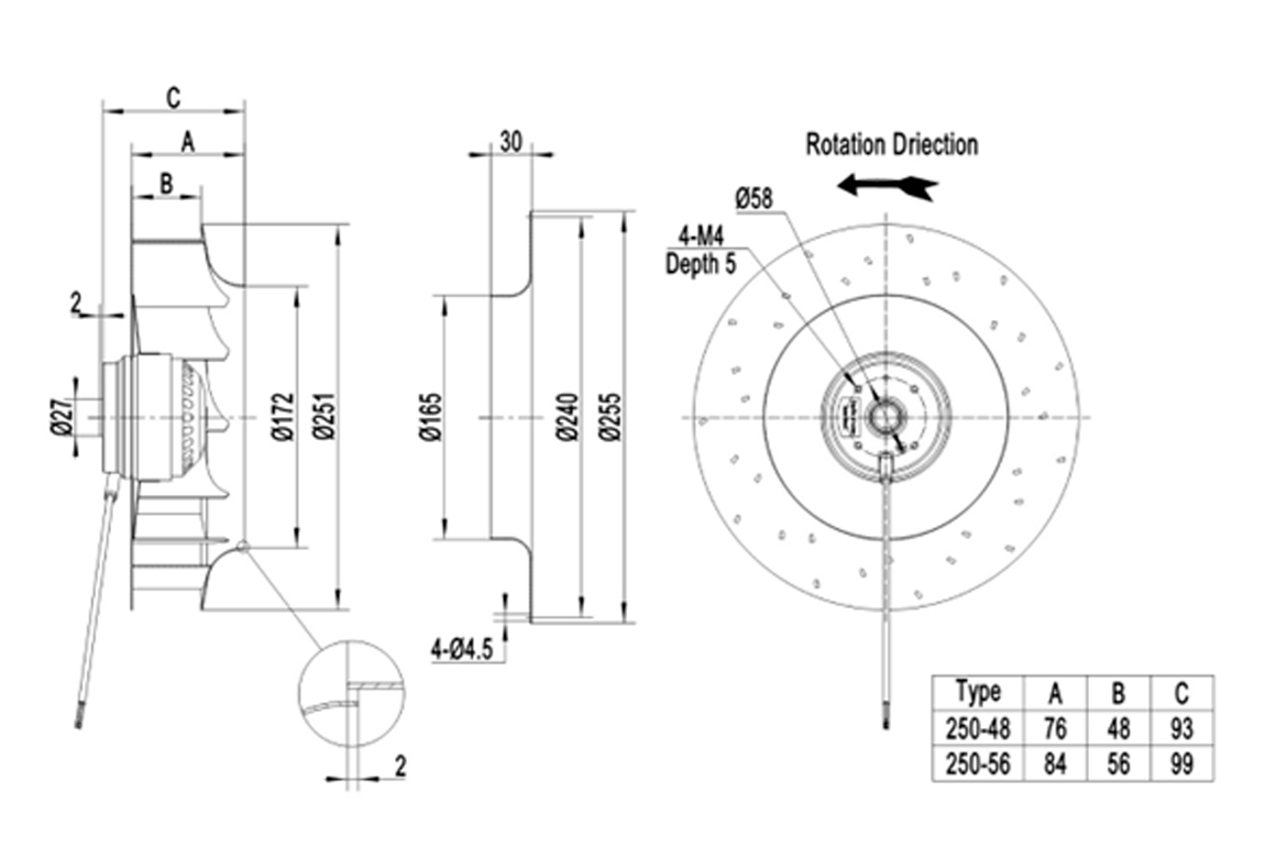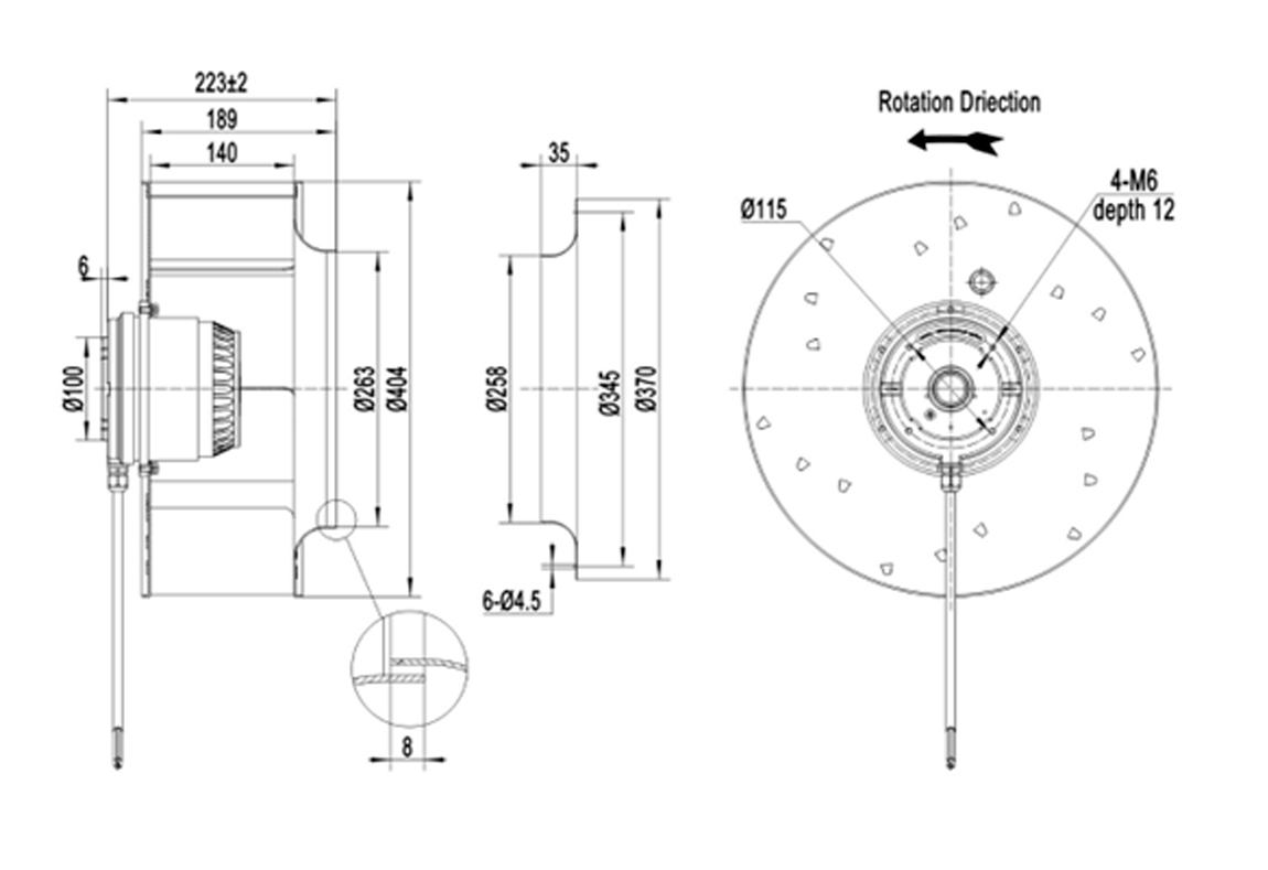 Os ventiladores centrífugos compactos cobrem uma faixa de diâmetros de rotor de φ190 a φ400 mm e apresentam design de rotor externo compacto. Eles geram alta pressão estática (até cerca de 2200 Pa) com baixo nível de ruído e alta eficiência. Esses ventiladores são amplamente usados em HVAC (aquecimento, ventilação e ar-condicionado), sistemas de exaustão e refrigeração em diversas indústrias (equipamentos médicos, data centers, eletrônica de potência etc.). Os modelos utilizam motor AC. Tipicamente o impelidor é de plástico e o rotor de aço. Todos têm proteção IP54, isolamento classe F e certificação internacionais.